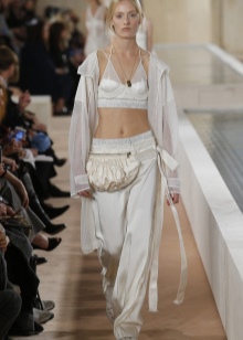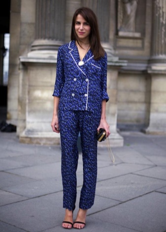 For lovers of simple styles without any hints of sexuality, modern fashion offers outfits in a dressing gown and pajama styles. A straight cut jacket and pants with an elastic band resembles a cozy home pajamas, and cute feminine prints will add originality to the female image.