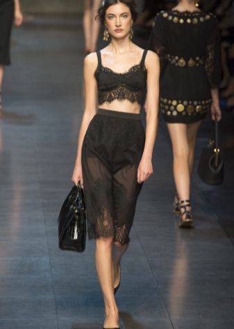 Black tops, skirts and dresses with lace trim look sexy. It is easier to combine other clothes with things of this color, and the black color visually makes the figure slimmer. Especially good black color will fit into the business image.