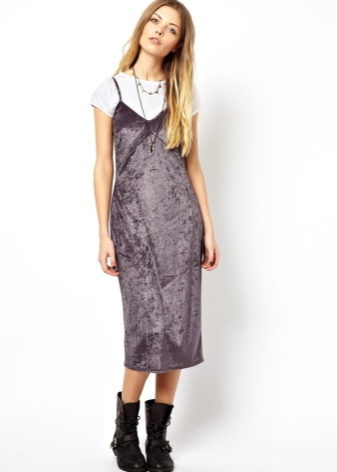 A combination dress worn over a t-shirt or turtleneck is one of the trendiest casual styles. You can wear snow-white sneakers or coarse and massive boots on your feet. In addition, in street fashion it is permissible to use such a dress as a tunic - the most daring fashionistas wear it with jeans and trousers.