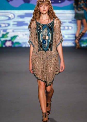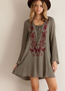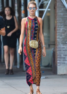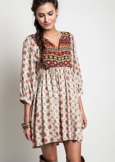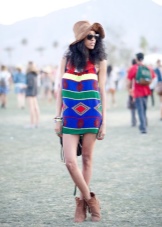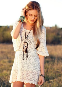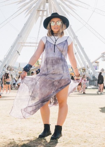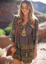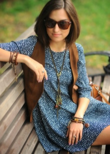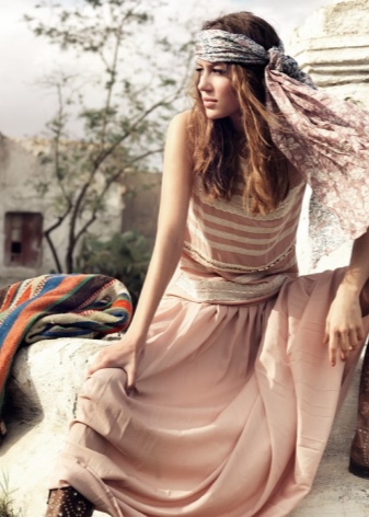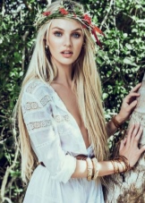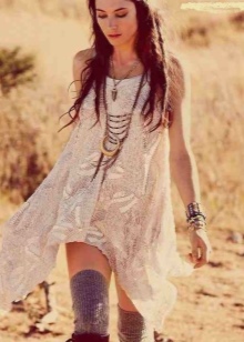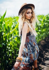 - The choice of dress is unlimited. It should be light, flowing and made of natural material. The style can be anything, but not tight. You can buy a model with an ethnic print or a plain version, and complete the bow with bright accessories. A gum hoop, with which you can add hippies or delicate notes of romance to your bow, will also be great.