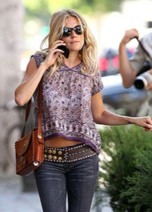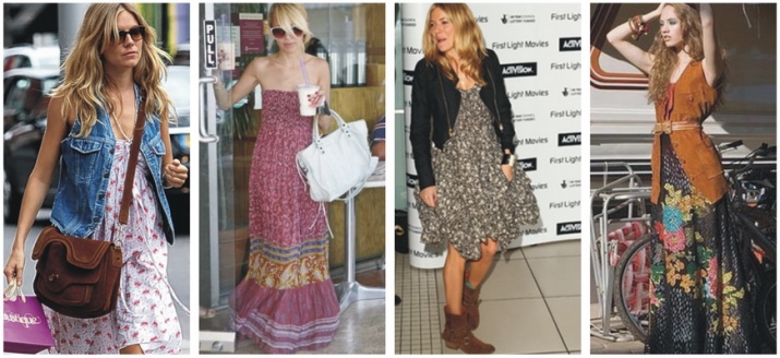 Sienna Miller was able to fit the bohemian style into a lax office dress code and diversified her urban bows for walks. The image consists of casual clothes. Each romantic dress or long skirt is successfully combined with massive shoes. At the same time, it is important that the image is laid-back, simple and convenient.