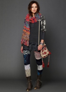She is unique: her urban style consists of black leggings and a short jacket worn over an ethnic print tunic. Narrow-top boots, a belt with a buckle and a large black bag complete the bow.
