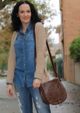 In the spring and cool summer, the combination of high-waisted jeans and a light colorful blouse will create an interesting fresh look. You can complement it with a denim jacket and white floral slip-on siphons. Of the accessories, a small beige handbag is suitable.