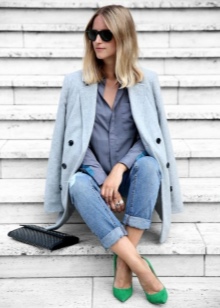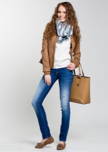 Bright accessories are a fashionable trend in casual style. Therefore, a voluminous bright green scarf will perfectly harmonize with a milky coat, jeans and light brown shoes.