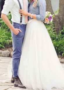 Casual brides can go in two ways - choose complete ease or combine it with classics. The first option is suitable for those who do not want to worry much about the dress and plan to wear it later. The second way is to choose a traditional outfit and combine it with bright accessories - a belt, bandage, ribbons, flowers.