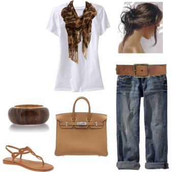 A trendy summer look provides a pair of spacious, light tunics with tucked jeans. Pointy light ballet shoes, a beige clutch bag, an original scarf and sunglasses will create a calm and delicate ensemble.