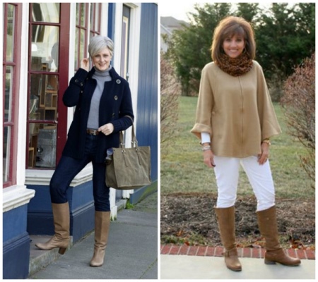 However, from time to time it is necessary to depart from generally accepted rules, therefore a coat or sweater of the color of Marsala, bronze, bright raspberry and orange shades is only welcomed among ladies of this age. Of the fabrics, it is preferable to opt for knitwear, cotton and denim.Choose a free style of clothing; pants, midi skirts, jeans, dresses and overalls will look interesting.