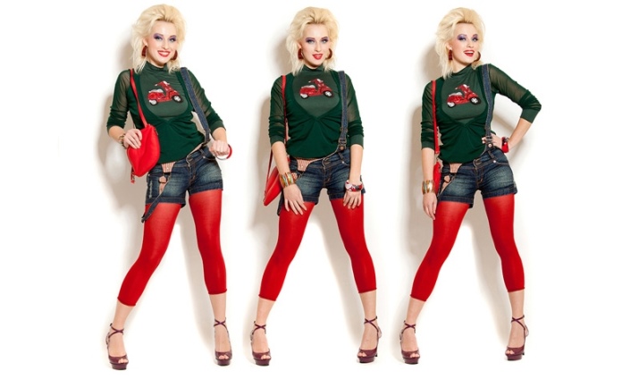 Another option for a fashionable image for a woman is a combination of short shorts and bright tights or leggings, t-shirts and trousers in bright colors, denim sundresses.