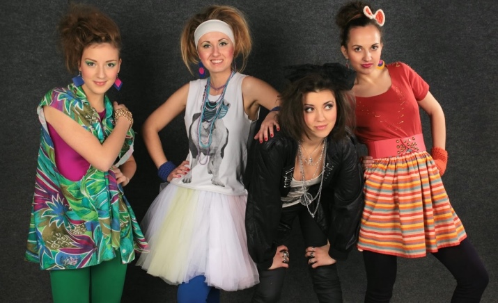 Everything played in contrasts, especially in female images. Different colors were mixed in clothes, accessories.For example, girls put several elastic bands for hair of different colors at once on their ponytail, combined bright red leggings, a green tunic and an orange bolero, accessories were not necessarily matched to the color of any item of clothing.