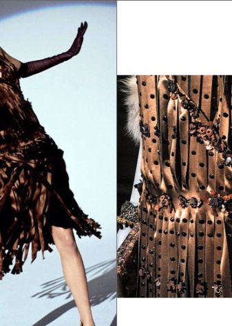 Fringes, made in the form of several tiers, are often used when sewing such outfits. With it, you can reduce the volume of the hips.