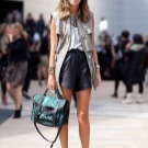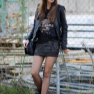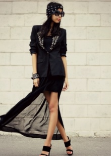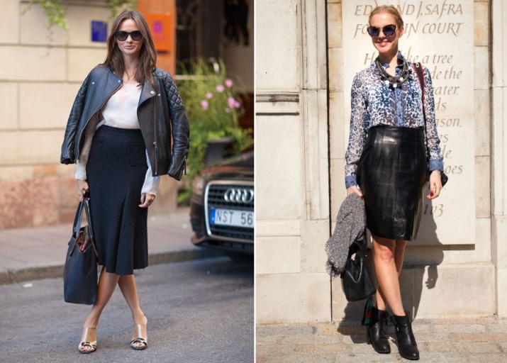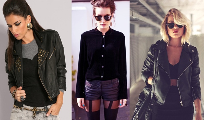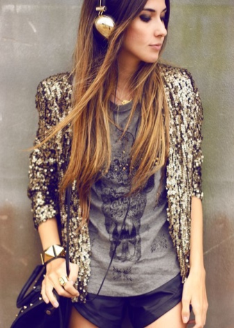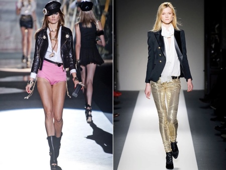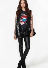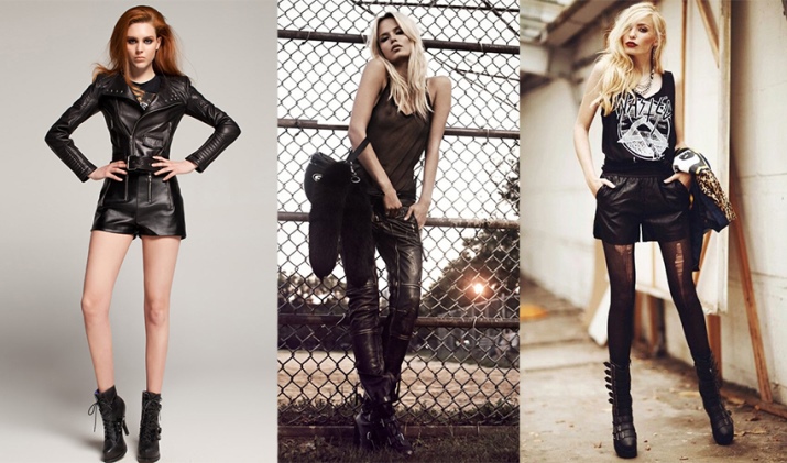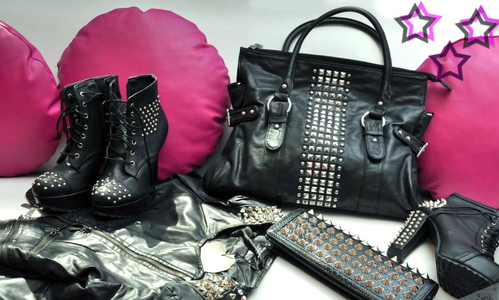 The presence of sequins, rhinestones and crystals is optional, but welcome. They are necessary for greater contrast with rough leather decorated with metal decor - spikes, buckles, rivets, chains. In the styles of products there are patch pockets, noticeable seams, lacing, drapery, oblique zippers.