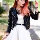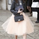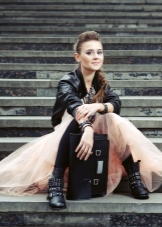 - Romantic glam rock outfit consists of a white top and a creamy fluffy tulle skirt, as well as a black leather jacket, leggings, flat-soled boots with metal decor. The image is complemented by a high hairstyle and dark makeup, a large number of accessories and a black bag.