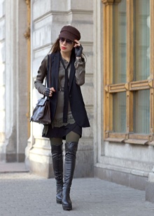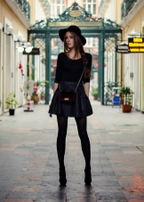 - A light, casual urban set with a fitted crew-neck sweatshirt, leather short skirt, black tights and boots. A burgundy crossbody and wide-brimmed hat are an accessory.