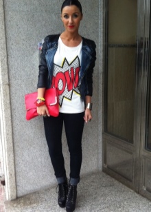 - A combination of leather-fitting trousers and brightly colored t-shirts. A brilliant black and beige jacket, bag and high-heeled shoes and platform complete the look.