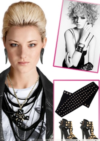 Particular attention should be paid to accessories, since in the image for every day it is they who largely determine their belonging to glam rock. Rivets and spikes, metal chains are needed on the bags. Topical jewelry and sunglasses, bracelets, chains, belts. In their design, the use of images of skulls, snakes, crosses, dragons is desirable.