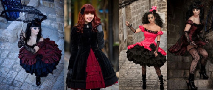 - Lolita (J-Goth). Destination is from Japan. Its main attributes are Gothic knee-length dresses, richly decorated with frills and crinoline. Umbrellas, hats, shoes with rounded toes on a high platform are used as accessories.