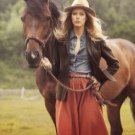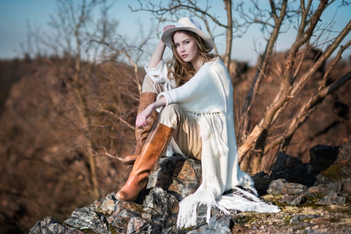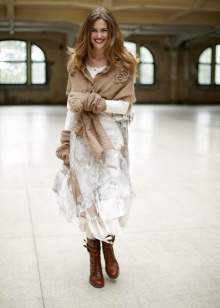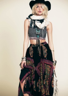 As already mentioned above, country style is characterized by long skirts, dresses, blouses, cardigans, hand-knitted sweaters, which are decorated with braid, lace or broach. If you need to emphasize ethnic orientation, then clothing that has embroidered designs, beadwork, fringe or some colorful ornaments will help in this.