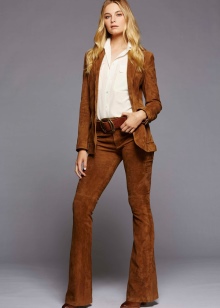 - tight pants made of genuine leather, which are decorated with fringe on the sides;