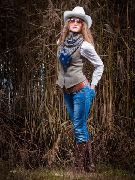 As a complement to the image of a country, you can buy a hat with wide brim, as well as boots that must have a sharp nose. If you tuck jeans in them, it will look great and emphasize the sensuality and seductiveness of the girl.