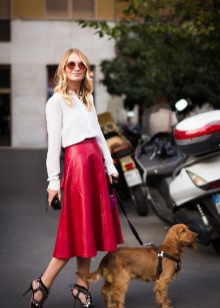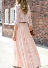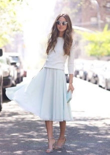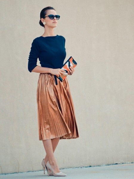 A more casual look may include a spectacular pleated satin skirt in a luxurious golden hue and a blouse with traditional sleeves in ¾ rich dark blue. Such a color scheme looks extremely impressive, but at the same time quite restrained. Beige boats, a small clutch, pearl earrings and classic sunglasses will perfectly complement this stylish look.