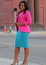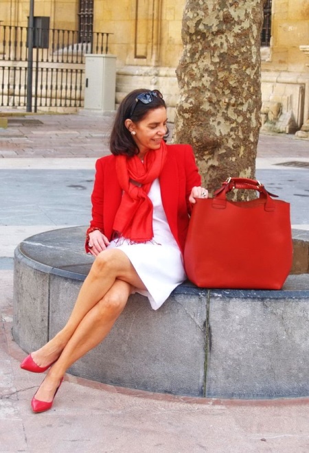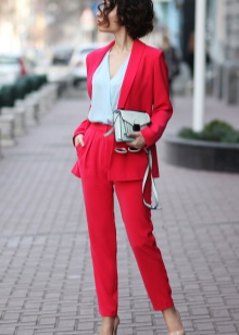 An excellent option for a successful business woman is a tweed red jacket with strict shoulders. In combination with it, a white midi-length dress will look very feminine and stylish. It is worth adding a bow with a bulk bag, a scarf and pumps to match the color of a jacket, and you can get a very elegant and unforgettable image that will remain in the customers' memory for a long time and thereby make a positive impression.