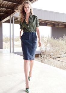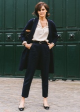 As a top for creating a strict but feminine look, you can choose a blouse or a shirt from satin, a plain blouse with sleeves and an O-shaped neckline will also look good.