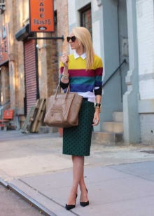 It is worth considering the moment that the waist line must be medium or high. The top in this case should be plain or darker than the bottom tucked into the skirt.