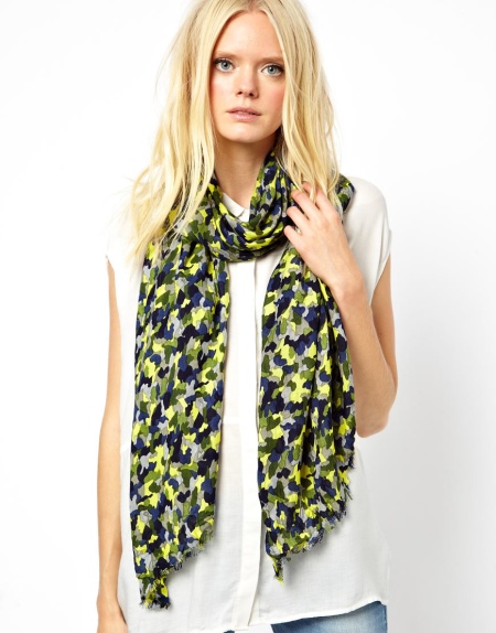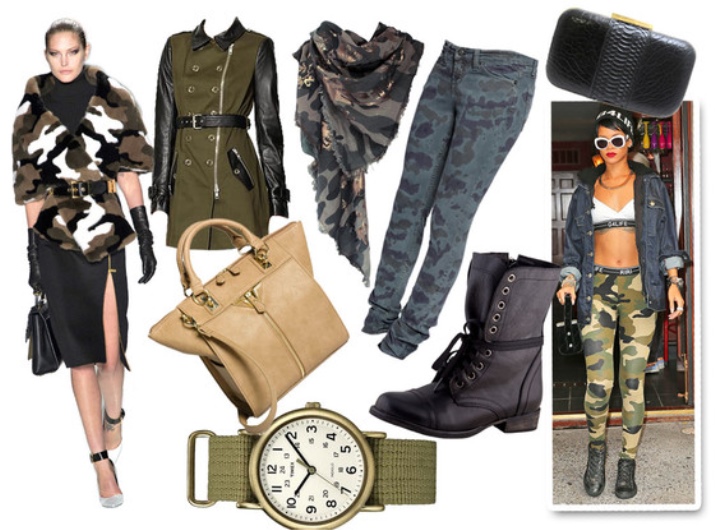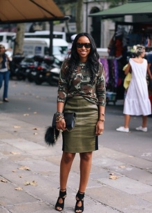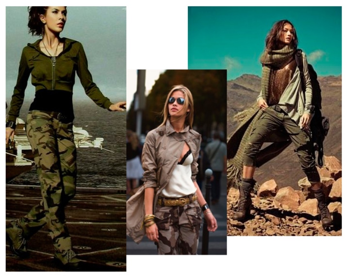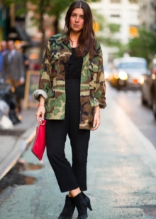 - Military notes can be added to many ladies' kits. It can be light blouses or turtlenecks and black trousers. With such ensembles, neck scarves and handbags with camouflage print will harmoniously look.