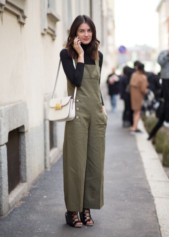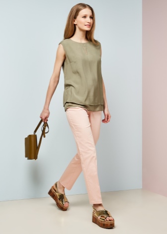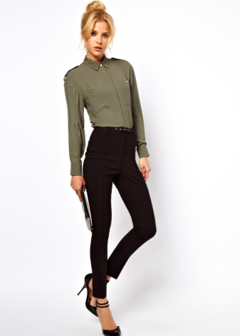 - To create a feminine look, you can pick up cropped trousers of a swamp color, a contrasting white blouse with a free cut and complement this tandem with black high heel boots and a black bag. This combination looks very impressive and sexy. If there is a sunny day in the yard, then the kit can be diluted with dark sunglasses.