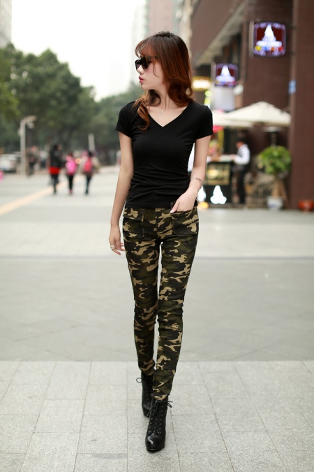 - On slender fashionistas, a simple combination of a black t-shirt and camouflage pants will look great. With such an ensemble, boots and boots with lacing can be put together. Shoes are recommended to choose from genuine leather in dark tones.