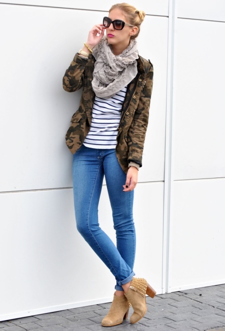 - For young fashionistas, a tandem of a light blouse, blue jeans, cream ankle boots and a camouflage jacket will ideally look. The blouse can be either plain or complemented by contrasting stripes. This stylish and youth kit can be complemented with a voluminous neck scarf and sunglasses.