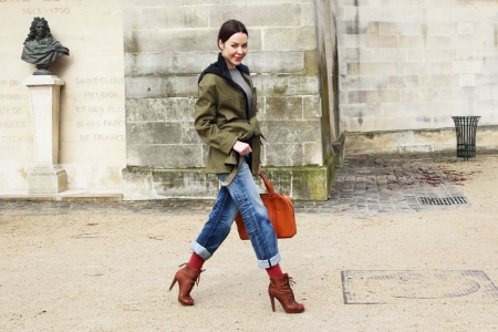 - For everyday walks, pick blue cropped jeans, a gray jumper, a light green coat and burgundy heeled ankle boots. Such a strict and attractive ensemble can refresh the feminine look. It can be supplemented with a large hand bag in dark red.