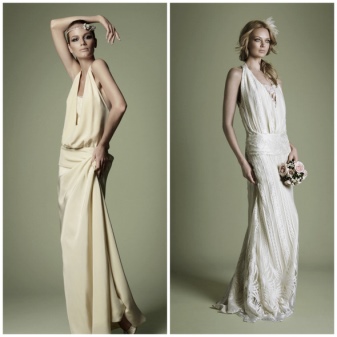 - Retro and vintage are becoming a popular theme for modern weddings. The fashion of the 20s is often used by brides to give their wedding dress elegance and femininity. The most relevant material for them are silk and satin of light shades, which are additionally decorated with lace and pearls. The maxi length is usually used, and the silhouette is emphasized by a low waist. Such a dress can be complemented by spectacular long gloves, which will become the main decoration of the girl’s sophisticated arms, as well as multi-layered pearl beads and a headband.