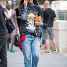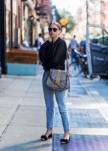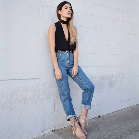 Sexy and original bow will turn out from a black top with a deep neckline, blue jeans and beige sandals with thick heels. The kit will look more vivid and attractive if complemented by a small black clutch and sunglasses.