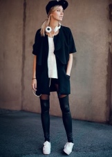 Slender girls often seek to emphasize a beautiful figure and long legs. To do this, you can put on an trendy outfit: a pea blouse, short black leather shorts and put on a cropped denim jacket. Fashionable sneakers or platform shoes will help emphasize the slender legs.