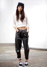 If you prefer hip-hop style, then you should dress up in harem pants, an original cut black top without prints and patterns, and ordinary sneakers on a flat sole. You can complete the image with a cap, bright large earrings and a voluminous ring.