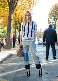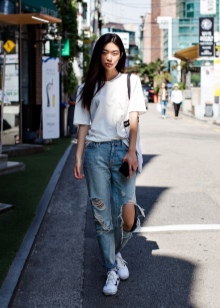 These two completely different directions look great with each other, forming relaxed and sophisticated images. The most striking things that represent the youth style are jeans. They can be multi-colored, torn and complemented by interesting fittings. Often this common thing is complemented by light tops, multi-colored t-shirts, shirts or sweatshirts.