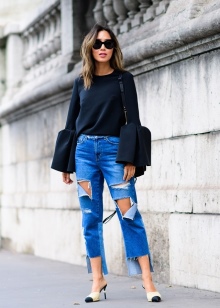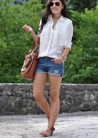 In warm weather, jeans can be replaced with short denim shorts. They can be torn and equipped with large pockets. Such outfits are appropriate not only for the summer season, but also for a cool winter. You just need to wear warm tights under the shorts and complement such ensembles with sweaters from yarn.