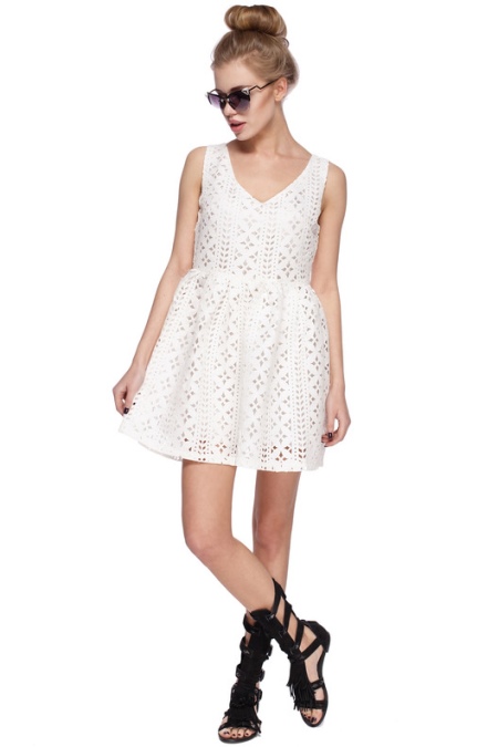 Pick up an airy dress with perforations, gladiator sandals and complement the look with stylish sunglasses. Such a simple and easy ensemble is suitable for slim girls with a beautiful gait and delicate skin tone.