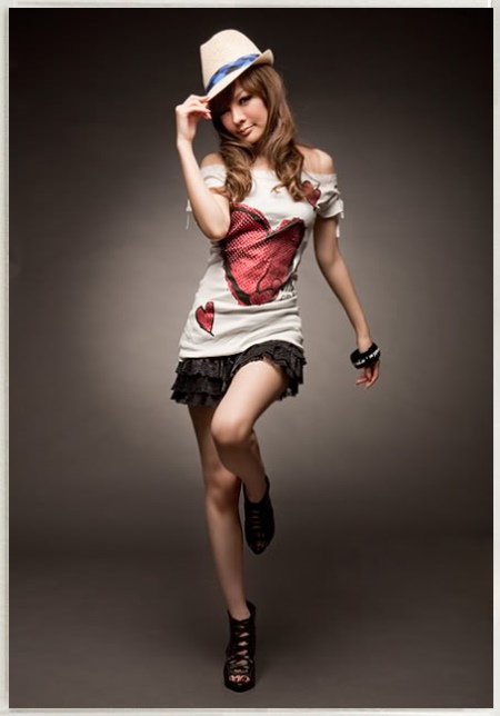 For energetic girls, a white T-shirt with drawings and one open shoulder, a short skirt with frills and summer ankle boots will do. Such a daring image should be supplemented with a large dark bracelet and a light hat. In this outfit, you can go for a walk with friends or a fun party.