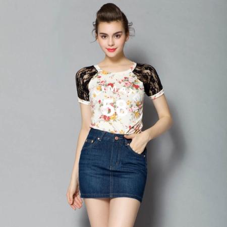 A cute and charming look can be created with a floral t-shirt with lace sleeves. You can supplement such clothes with a regular denim skirt above the knee. Such a simple ensemble will look very easy and relaxed.
