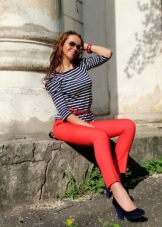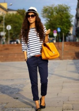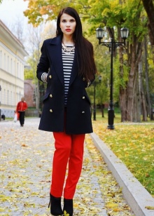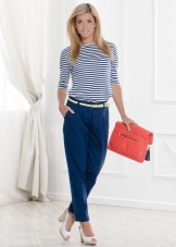 For a hot summer, capri pants or narrow-cut trousers, ankle-length, are ideal. When choosing color solutions, there are no restrictions, although it is customary to consider blue, black and red as traditional colors in a marine style.