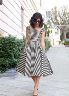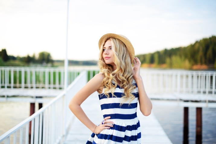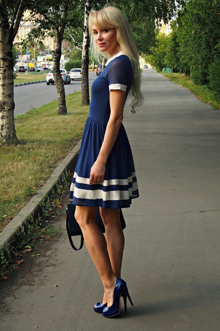 The model of the dress can be selected depending on where you are going to wear it. At a party or a festive event, you can choose a dress of any style and length. For an evening look, outfits of noble colors are ideal. The most popular is blue and white. And do not forget that striped models are not suitable for every figure.