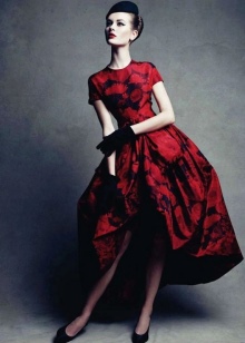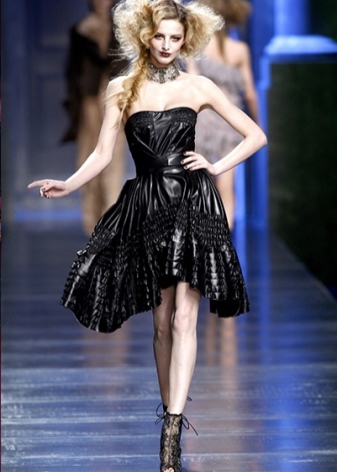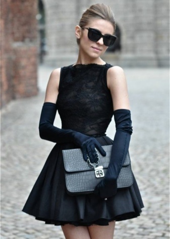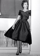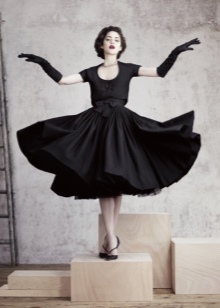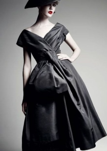 The classic look consists of a black A-line dress with thin straps. You can supplement it with gloves and shoes of a similar tone. An exit to the light will be decorated with an evening black sheath dress with bare shoulders and an asymmetrical hem. To complete the bow, heel shoes will match the dress.