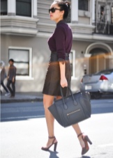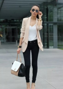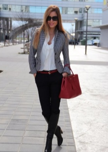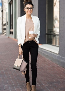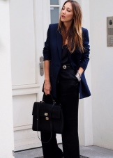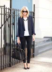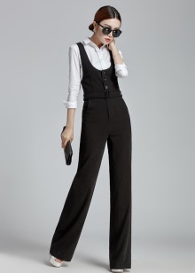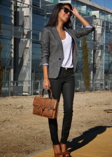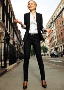 You can show your status with a black three-piece suit (jacket, skinny trousers and a vest) and a snow-white shirt with a collar and frill. This outfit is complemented perfectly with black stilettos and a large black leather bag.