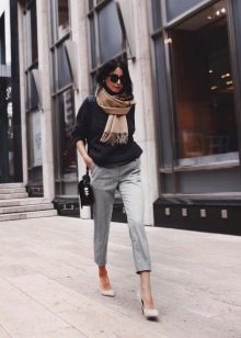 A youth business casual can be made up of a white classic short sleeve blouse, black trousers and a scarf in a similar shade of trousers. Beige or black additions will become stylish accessories of the bow: open shoes, a clutch bag and a thin belt.Loose hair and natural makeup - and the urban business image is ready.