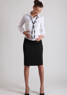 Pregnant business women are shown plain dresses, sundresses of classic length with a fabric belt, jackets without shoulder pads, scarves, bracelets and comfortable shoes at low speed.