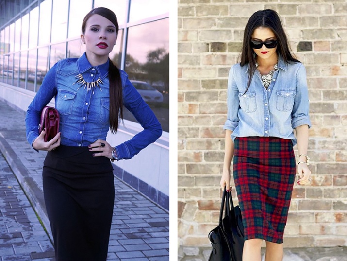 Denim shirts have become a new current accent. Their cut is often straight, the sleeves can be shortened. Such products are good in combination with skirts or trousers from similar textiles.