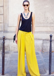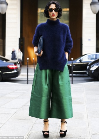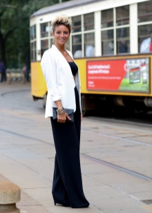 Wide trousers, according to fashion houses and venerable experts, let your imagination run wild. In addition to the usual beige, black and white, you can find models with a floral print or those where one leg is black and the other is in a thin vertical strip.