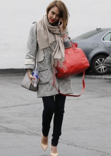 Although Jessica Alba is the owner of an enviable figure, a knitted cardigan of such a plan could hide flaws in the buttocks. A very simple but stylish city bow, which, if desired, can be diluted with a colored scarf or a colorful scarf.